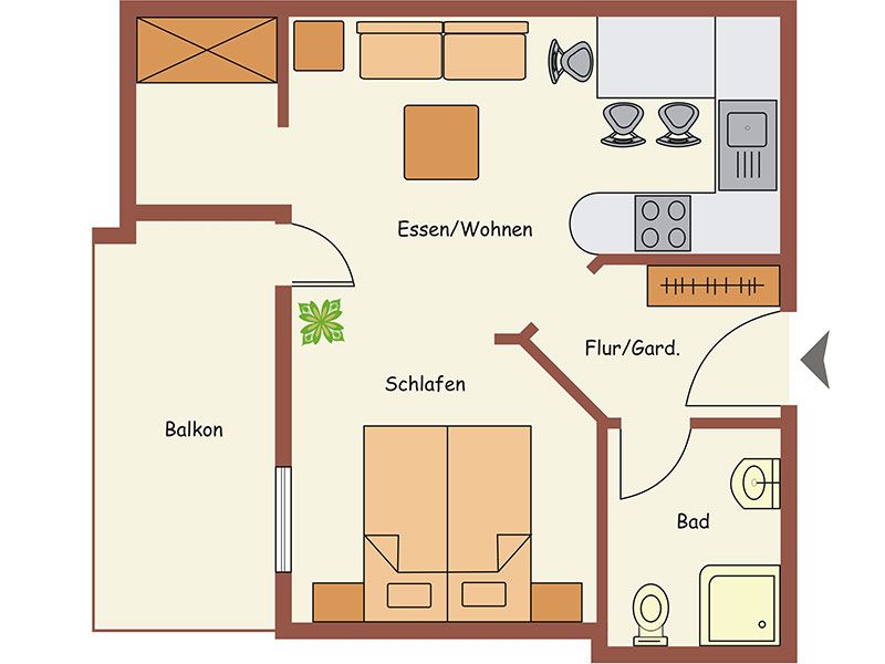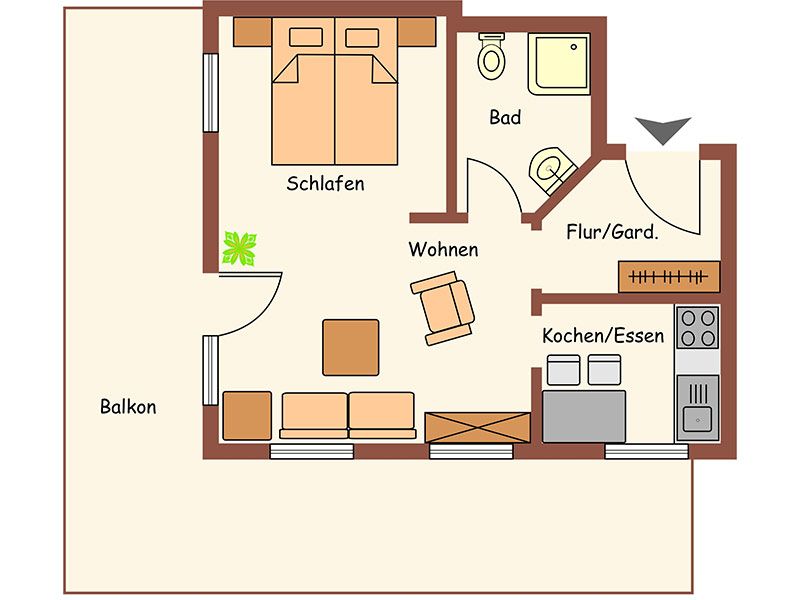 Wohnfläche ca. 52 m², Schlafraum, Wohnraum mit Sitzecke und Ausziehcouch, Kochzeile, Bad-WC, Süd-Terrasse.