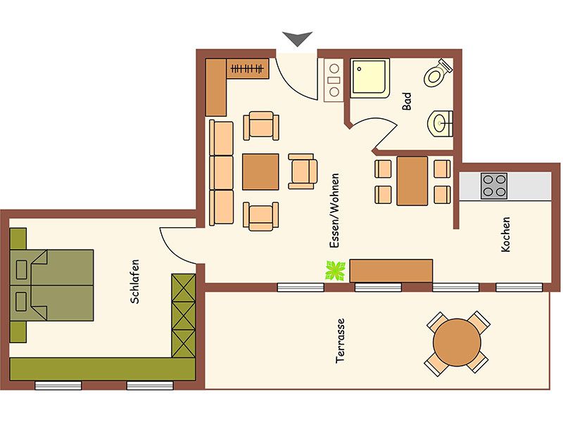 Wohnfläche ca. 52 m², Schlafraum, Wohnraum mit Sitzecke und Ausziehcouch, Kochzeile, Bad-WC, Süd-Terrasse.